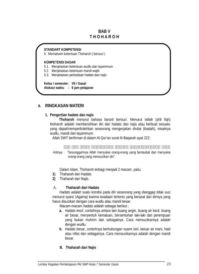 Hadas diartikan sebagai suatu keadaan yang membuat seseorang tidak suci badannya sehingga wudhu dan sholat bisa batal karenanya. Batu atau benda keras lain yang suci untuk istinja' setelah buang air kecil atau besar; . Menjelasakan pengertian hadas dan najis serta menunjukkan dasar hukumnya. Cara mensucikan hadas dengan wudhu, . Tatacara bersuci 57 untuk tayamum atau pengganti mandi;