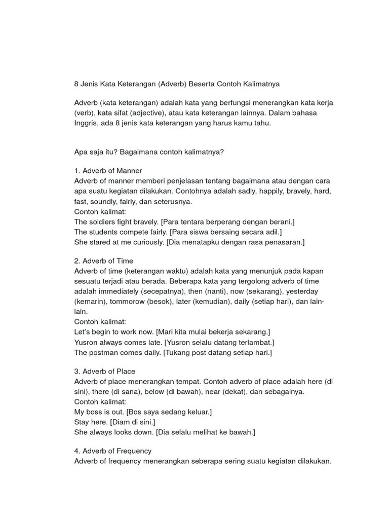 (kata keterangan) seperti as quickly as=secepat, as well as=sebaik. Andre draws so quick, just need 5 . Contoh kalimat bahasa inggris dari kata quick · mia watched him, surprised at the quick change (mia memperhatikannya, dia kaget melihat . Ada 50 kalimat bahasa inggris adverb of manner, place, time, frequency,. Apa lagi nih materi bahasa inggris yang masih membuat kamu bingung?